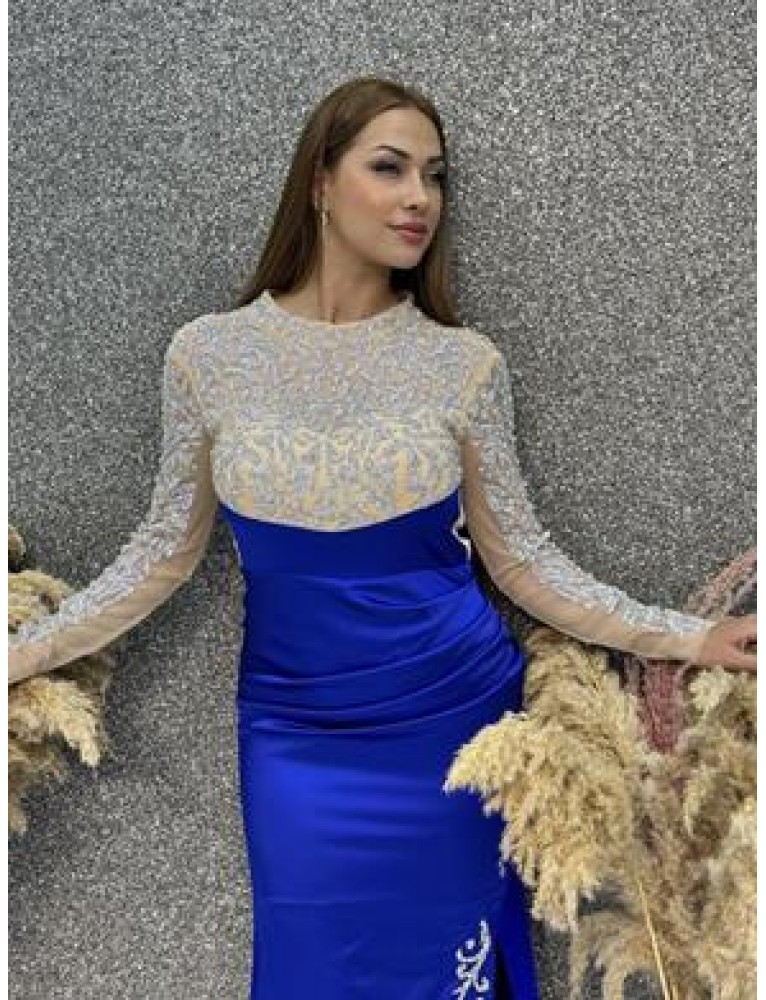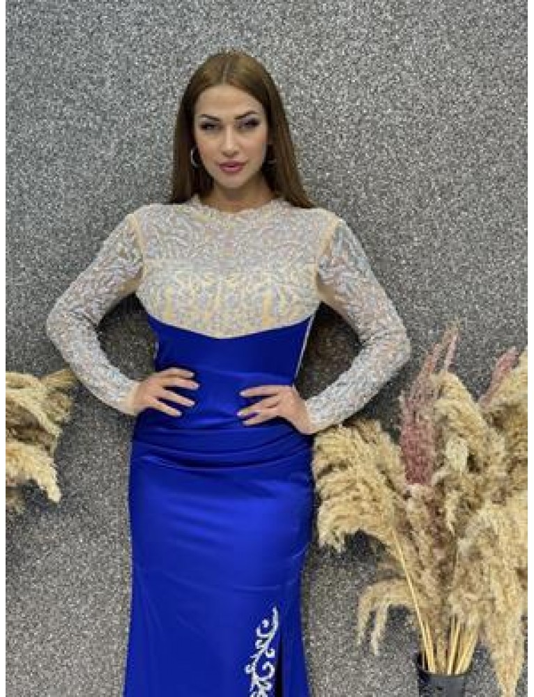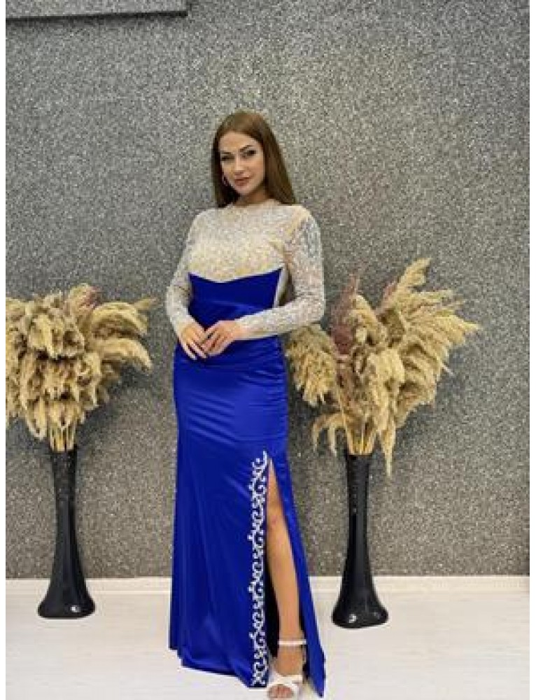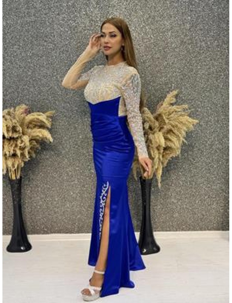 Uzun Kollu Taş Baskılı Yırtmaçlı Saten Abiye